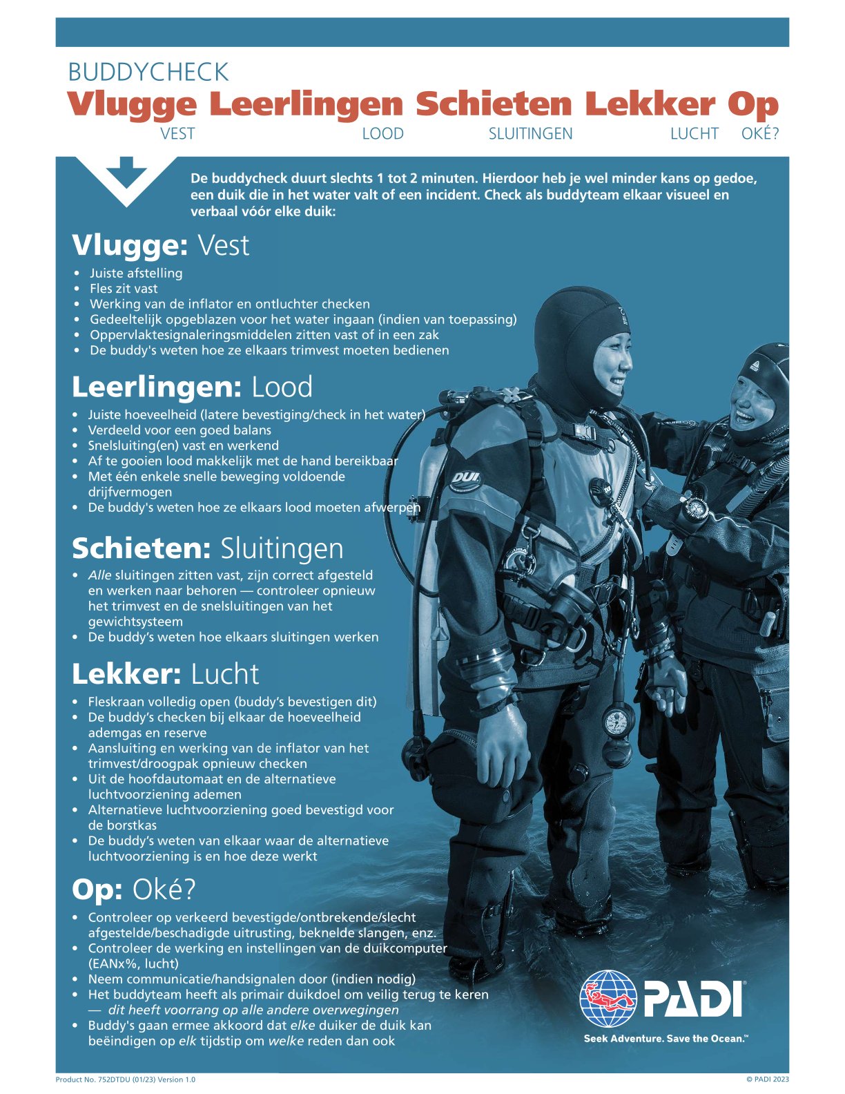 Voor de duikveiligheid is het altijd belangrijk om voorafgaand aan elke duik een BuddyCheck te doen.